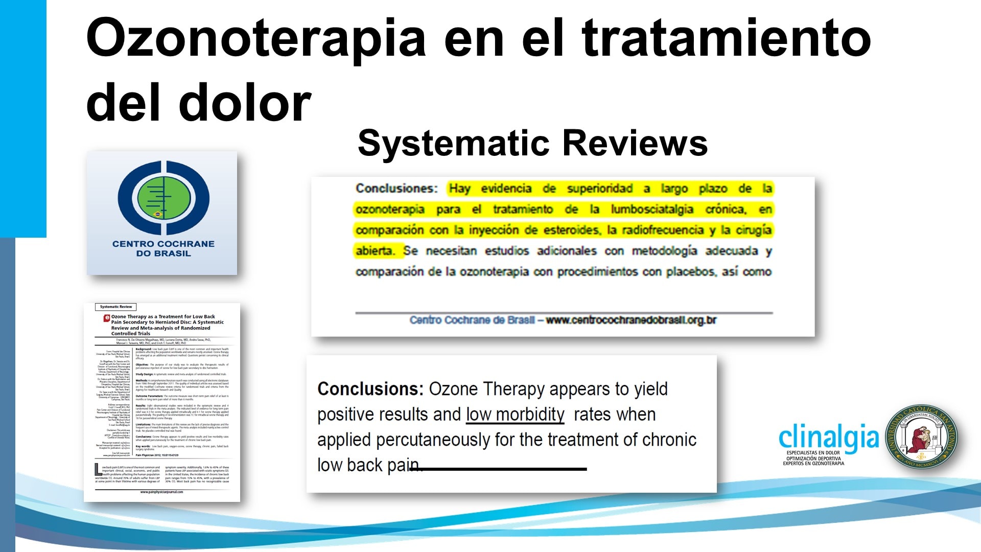 Una revisión de la guía Crochane concluye que hay evidencia de la superioridad a largo plazo de la ozonoterapia, para el tratamiento de la lumbalgia crónica y concluye después de revisar todos los trabajos de calidad publicados en el mundo, que la ozonoterapia es más eficaz y bien tolerada, más que los corticoides, la radiofrecuencia o la cirugía abierta.